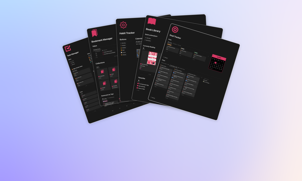 Skip the setup process and dive into organizing your tasks, bookmarks, habits, books, and goals. Simply duplicate and customize these plug-and-play templates for instant productivity.