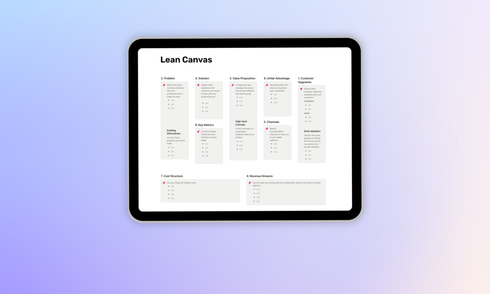 This Notion template helps you to lay out 9 key elements of your business idea: