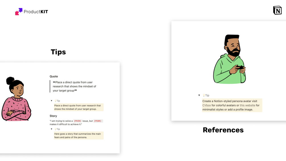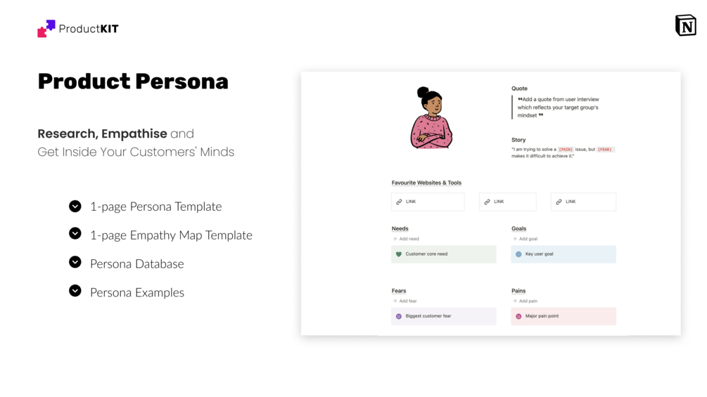 This Product Persona Notion Template is a fun and easy way to capture your user research, visualize your typical customer, and create products that make a real impact.