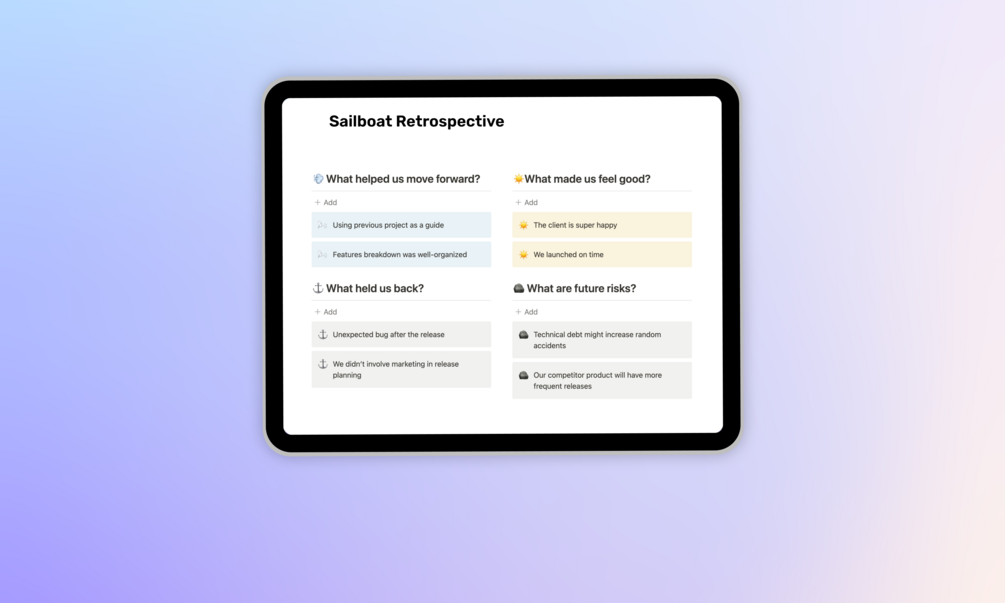 ➤ Sailboat retrospective is an engaging way for your team to identify what’s working and what needs improvement in any project, sprint, or overall process. This Notion Template outlines 4 Steps to help you reflect as a team on sprint goals, strengths, blockers and future ambitions.
